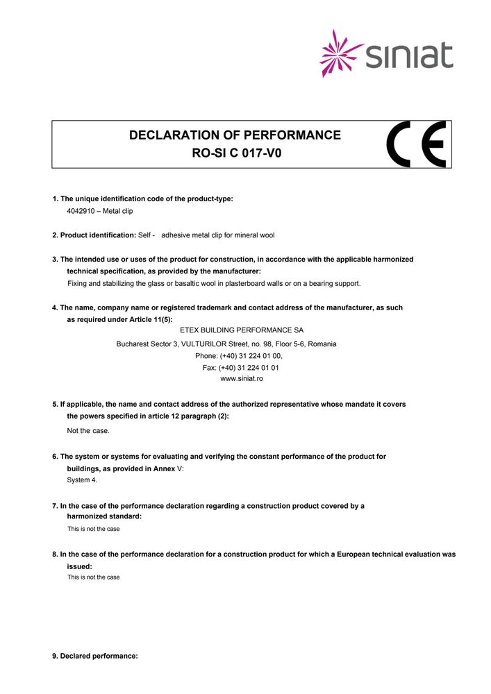 Declaration of Performance according to the Construction Products Regulation EU No. 305/2011 for Adhesive Metal Clip