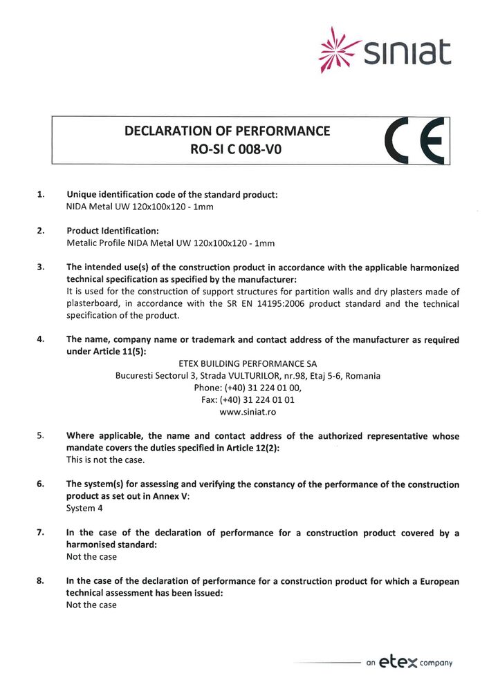 Declaration of Performance according to the Construction Products Regulation EU No. 305/2011 for UW 120x100x120 1mm NIDA Metal