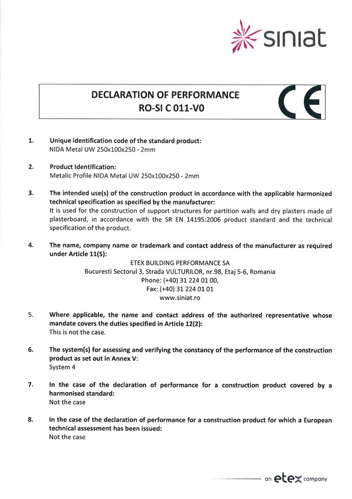 Declaration of Performance according to the Construction Products Regulation EU No. 305/2011 for UW 250x100x250, 2mm NIDA Metal